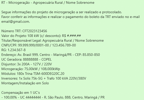 Após a compensação do pagamento da ART/TRT, será enviado a documentação para o cliente assinar.
